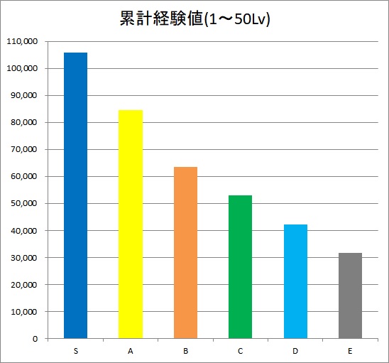 Lv S A B C D E 1~20 5,114 4,092 3,071 2,561 2,046 1,535 21~30 9,747 7,797 5,848 4,873 3,899 2,924 31~40 25,280 20,225 15,170 12,640 10,111 7,583 41~50 65,574 52,459 39,345 32,787 26,231 19,673 - レベル上限解放